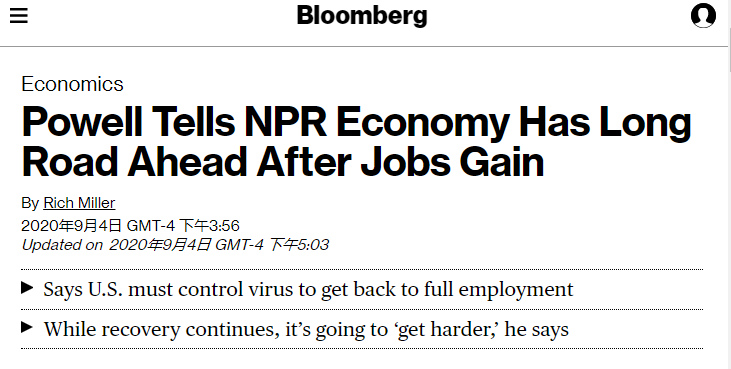 △彭博社报道,美联储主席鲍威尔在最新就业报告发布后表示,美国经济复苏需要较长的时间
