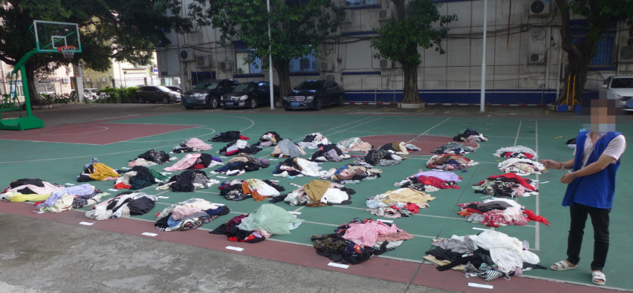 现场取证后,民警出动10名队员将衣服运回所里进一步调查,经过整理统计,竟有千余件衣物!其中大部分为女性的裙子和贴身衣物,摊开可铺满大半个篮球场!
