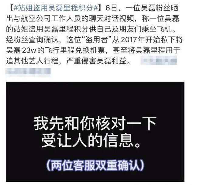 近日,“站姐盗用吴磊里程积分”的话题登上微博热搜榜,演员吴磊的一位粉丝晒出与航空公司工作人员的聊天对话音频,称另一名粉丝多次盗用吴磊航空里程兑换机票,共使用掉23万飞行里程。