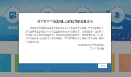 2月20日,羊城晚报全媒体记者登录国家税务总局广东省电子税务局官网发现,该网站发布《关于暂不申报缴纳社会保险费的温馨提示》。