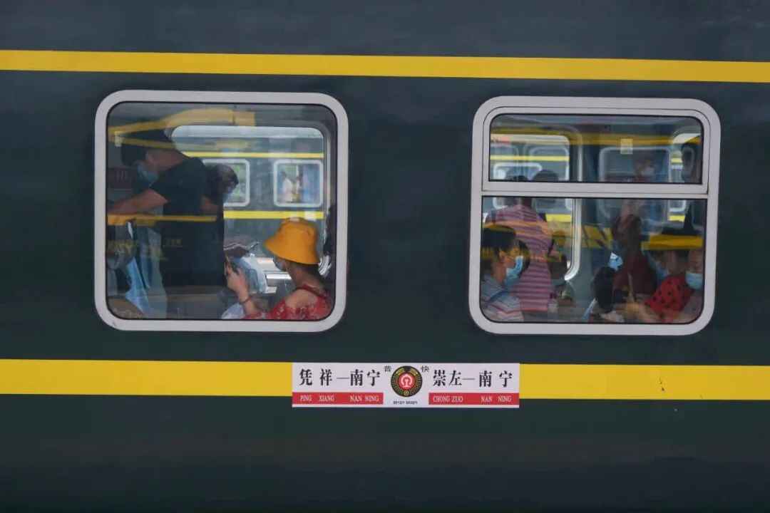 大学生陈静静独自一人坐在座位上,自在地捧着一本书,偶尔吃一口零食。她经常乘坐这趟慢火车,在南宁的家和崇左的大学之间往返,每个月她会乘坐一两次,这一坐两年就过去了。她说,这趟车能让她从快节奏的生活与学习中解脱出来,很喜欢这样的感觉。