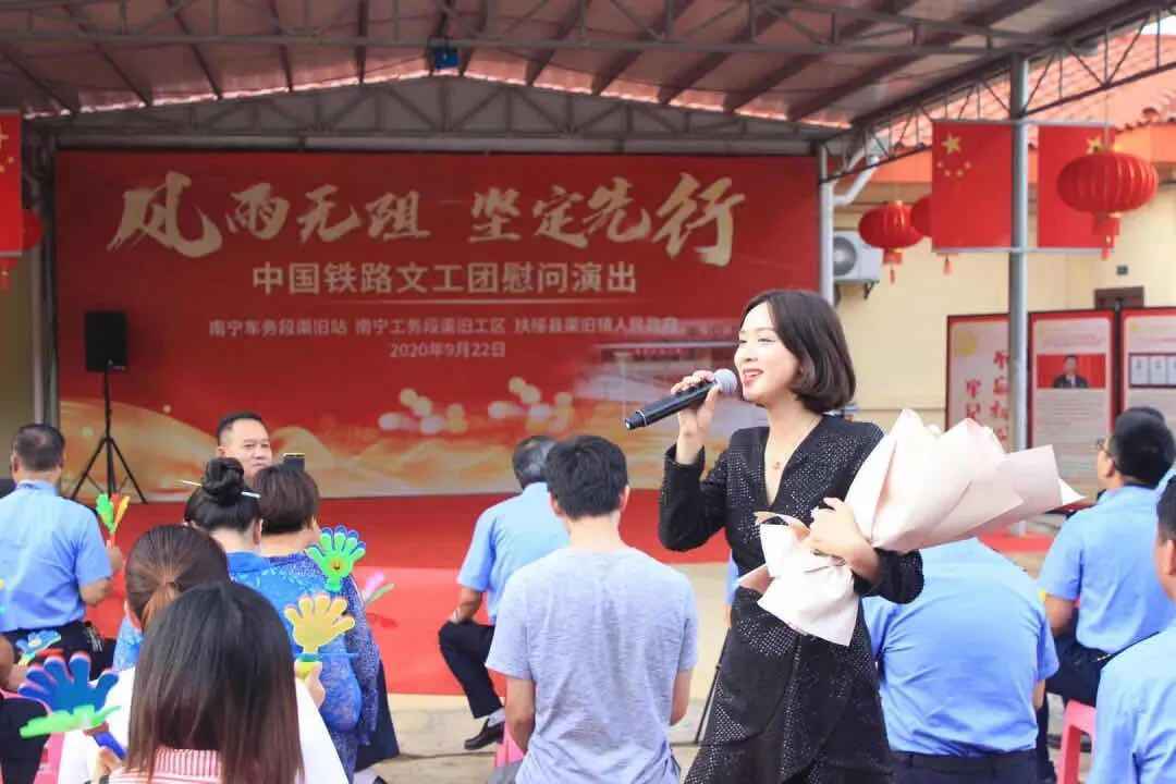 9月22日,中铁文工团演员走上渠旧站台,与南宁车务段职工们联合演出,以独唱、合唱等形式,为职工和家属带来《最美是你》《追梦飞翔》《美丽的心情》等节目。舞台下,观众们报以热烈掌声,为演员送上鲜花,还拿起手机拍照留念,记录下这欢乐一刻。