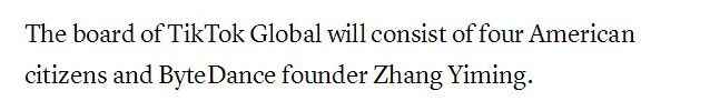 美国消费者新闻与商业频道(CNBC)报道:新组建的TikTok Global董事会中将有4名美国公民。