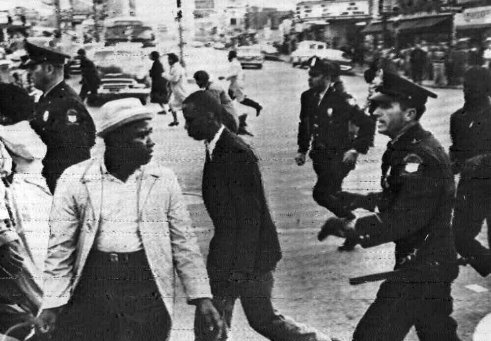 1960年,美国20多个州的黑人举行示威,抗议餐馆、商店和其他公共场所实行种族隔离。这是田纳西州恰塔努加城的黑人在举行抗议示威时,遭到警察的镇压。(新华社1963年8月23日发)