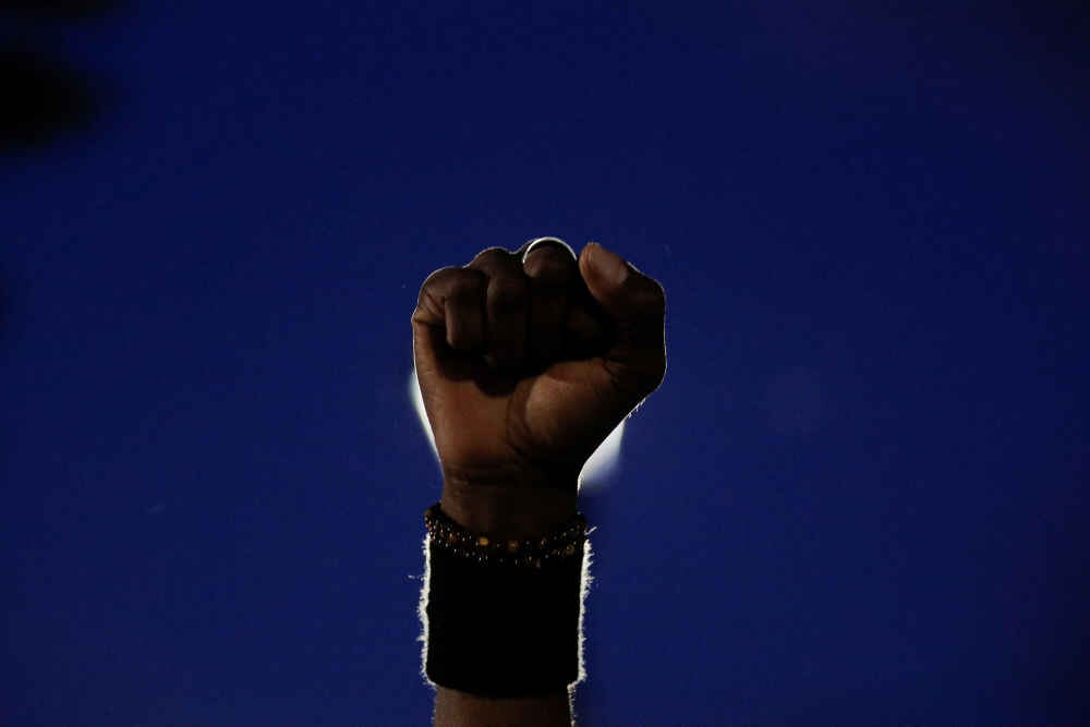 9月4日,在美国纽约州罗切斯特市,抗议者高举拳头。(新华社/路透)