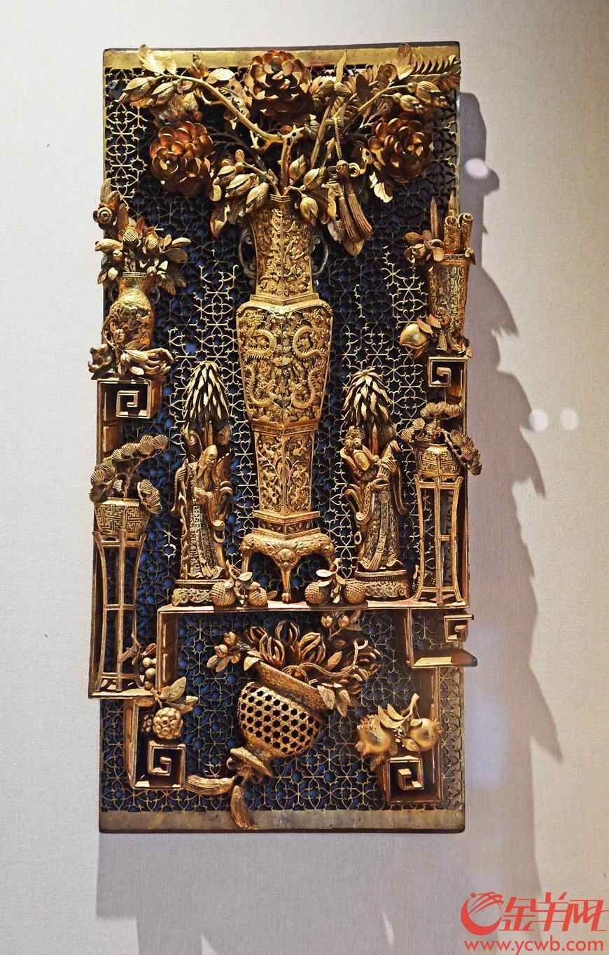 此挂落来源于广东佛山地区,主要采用镂空雕技法,除左右下角饰荷花外,其余均满饰荔枝,并雕有二十多只鸟腾跃于枝头。此挂落画面饱满,密而不乱,雕刻生动,立体感强,色彩明艳,富丽繁华,在民居建筑中营造出荔果满枝的岭南夏日风情。