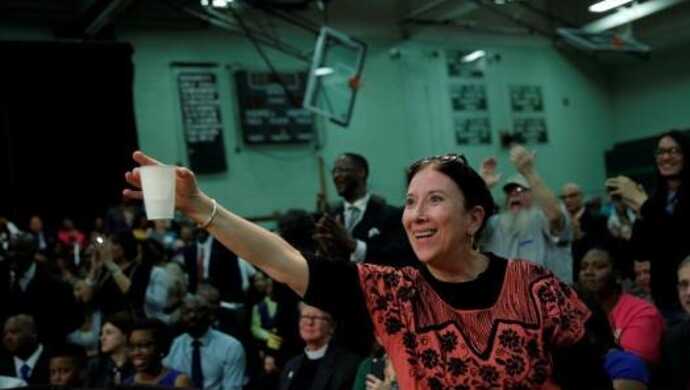资料图为美国密歇根州弗林特市一名市民手里举着过滤过的一杯自来水。