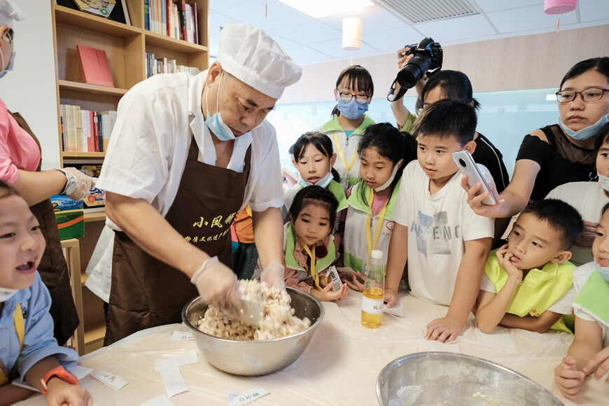 “哇,好香啊!”同日下午,一场色香味俱全的“小凤饼”非遗制作展示活动在粤菜文化印象馆热闹开场。小凤饼制作技艺省级非遗传承人薛锐明,现场为大家分享小凤饼背后的传承故事,讲解小凤饼的制作方法,并手把手教小记者们制作小凤饼。