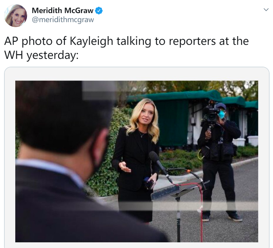 △《政治》驻白宫记者新媒体截图:美国白宫新闻发言人麦肯尼在确诊前一天不戴口罩与记者交谈。