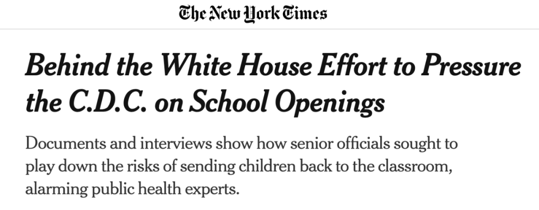 △《纽约时报》报道:白宫内部文件称,秋季学期开始之前,白宫高级官员多次向美国疾控中心(CDC)施压,淡化重返学校的风险。