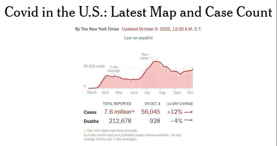 根据《纽约时报》的报道,当地时间10月8日,美国至少报告了928例新冠肺炎病亡病例以及56045例新增确诊病例。在过去一周中,平均每天的新增病例为47036例,比两周前的平均水平增加了12%。
