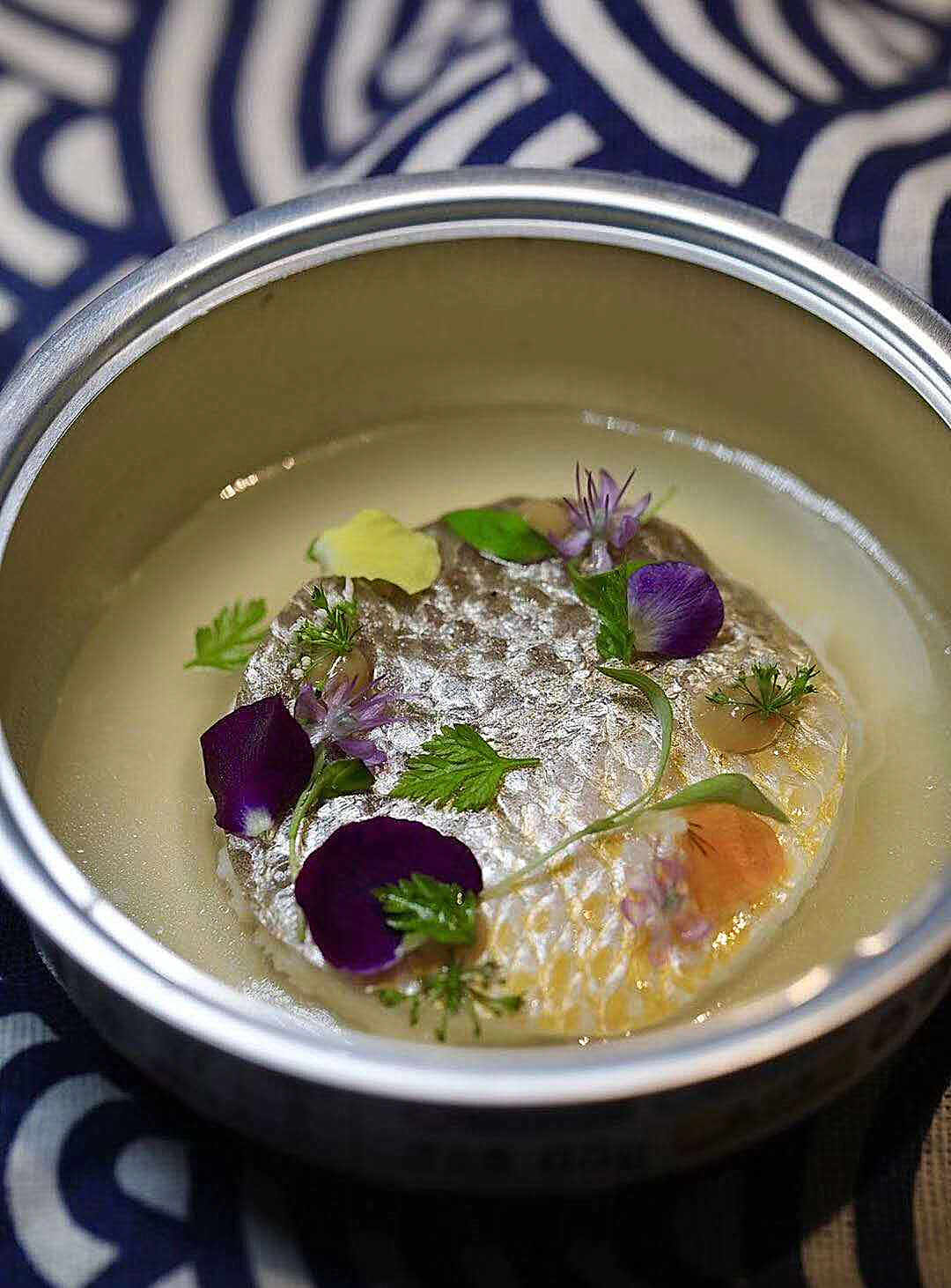 鱼子酱卤水鹅肝是“跃”的招牌菜,大厨选用法国鹅肝,用潮州卤水方式做成鹅肝酱,在其表面铺上鱼子酱,同时还用分子料理手法点缀了几颗貌似鱼子的意大利黑醋珠子。食客品尝时,鱼子酱的咸鲜让鹅肝酱的卤水味更加出彩,而意大利黑醋珠子轻轻咬破后,又暗合了潮菜卤水要蘸醋的传统习惯,整个品尝过程可谓妙不可言。