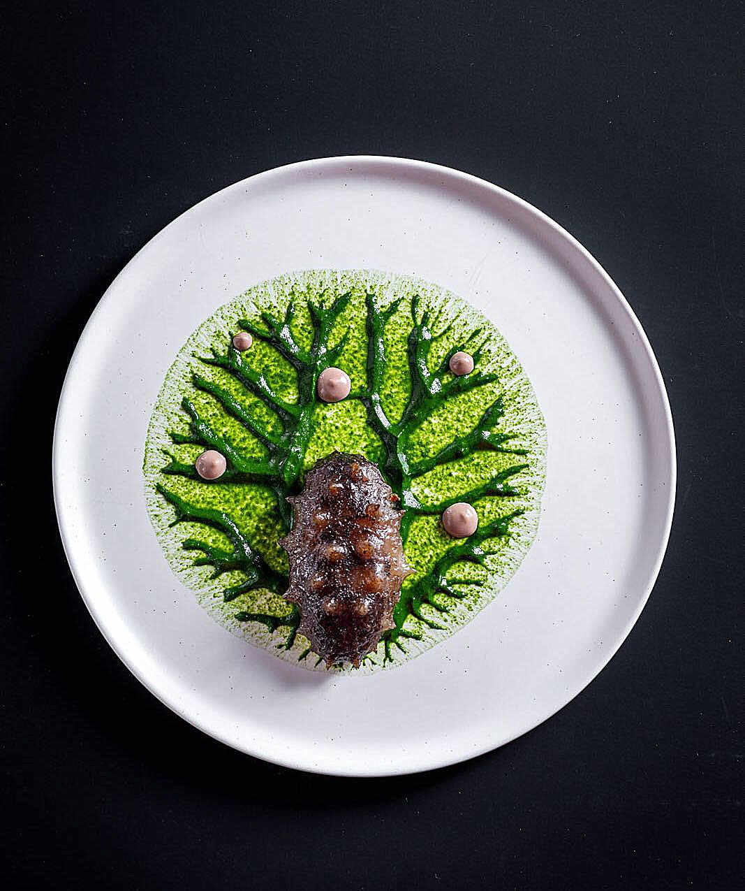 护国菜羹是潮州一道传统特色美食,而鲍参翅肚又是高端潮菜的一个重要标志。“跃”把护国菜做成酱汁,并在盘中画出海底珊瑚的图案,把海参放置其中,并点缀几滴虾酱——海洋的气息扑面而来,吃海参的时候伴着家乡风味的护国菜汁和有咸香提鲜作用的虾酱,这道护国菜羹伴海参无论在视觉上、味觉上都是一大享受。