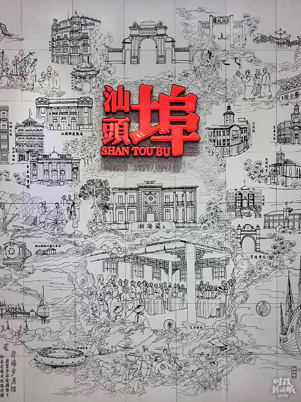 △陈列馆内的开埠文化壁画,高度达4.8米,宽度达4.2米,以素描形式展示了开埠150年间汕头政治、经济、文化的演变。(资料图)