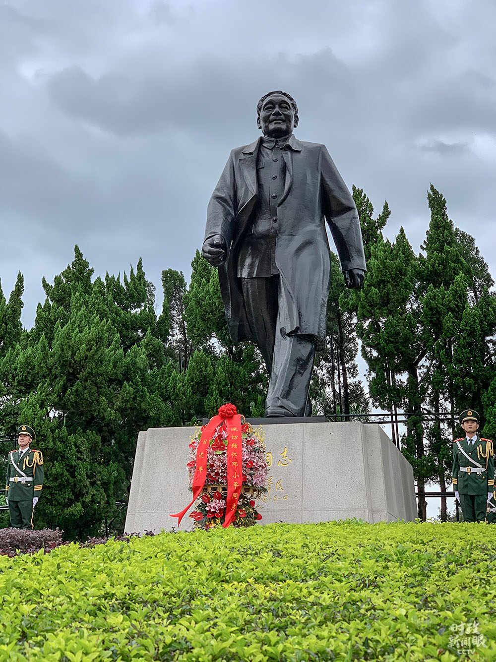 △邓小平铜像北侧是一块长达13米、高4.35米的花岗岩石墙,石墙北面镌刻着邓小平同志1984年视察深圳时的题词:“深圳的发展和经验证明,我们建立经济特区的政策是正确的。”(总台央视记者王冰拍摄)