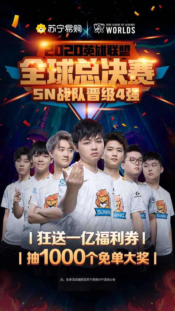 10月16日晚, 2020英雄联盟全球总决赛1/4决赛第二天对决结束,苏宁易购旗下电子竞技俱乐部SN战队以3:1总比分击败JDG战队,成功晋级半决赛,并成了第一支晋级四强的LPL(中国大陆赛区)战队。为了庆祝晋级四强,苏宁易购将全网发放1亿元福利券,抽1000个免单大奖。
