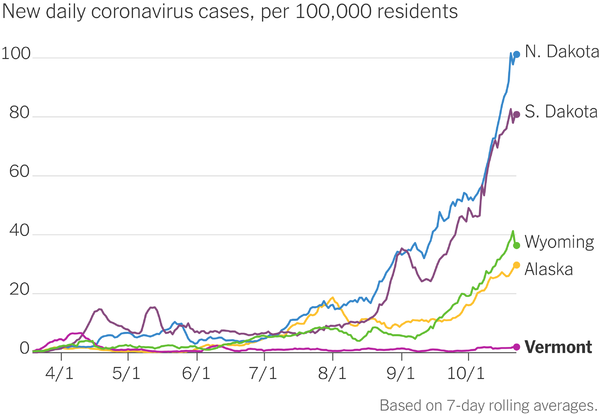 △《纽约时报》统计每10万人中单日新增病例数据。依次为北达科他州、南达科他州、怀俄明州、阿拉斯加州以及趋于平稳的佛蒙特州