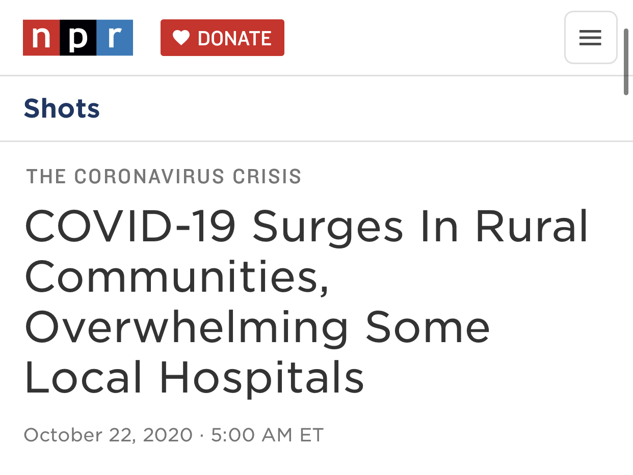 美国的第三拨疫情正在暴发,中西部农村地区成为新的“震中”,原本就脆弱的医疗系统更是不堪重负。一些专家警告称,农村地区疫情防控难度更大,唯有尊重科学、放弃政治偏见才能渡过难关。