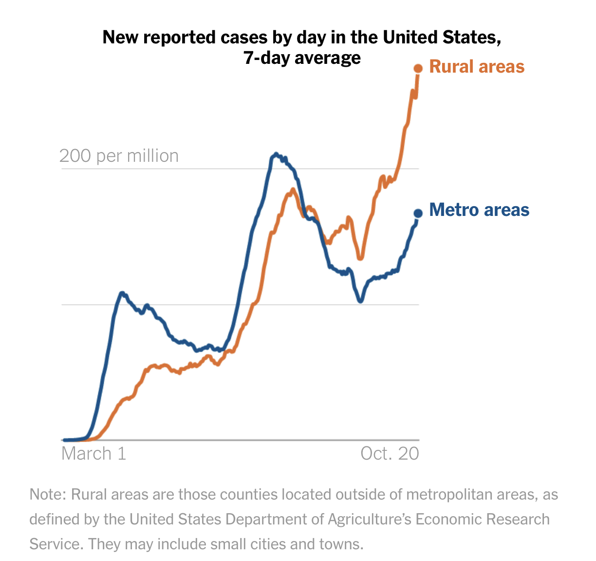 秋冬季的新一轮疫情暴发席卷美国农村地区。根据《纽约时报》的数据显示,农村地区的每百万人确诊病例数大幅超过城市地区,高出两倍。