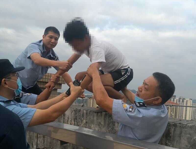 接报后,值班所领导胡建新及民警叶永刚立即赶赴现场,发现一男生蹲在楼顶外飘窗,三面没有任何防护栏,距离地面约100米的楼顶风大且冷,掉下去后果不堪设想。民警与消防应急人员火急商量对策,这时男生突然站了起来往平台边缘后退了几步。民警叶永刚随机应变,马上以幽默的聊天吸引男生的注意力:“我们是人民警察,能够解决的问题不是问题……”一步一步打开了男孩的话匣子,得知原来男生因与父母产生矛盾,一时想不开才意图跳楼轻生。