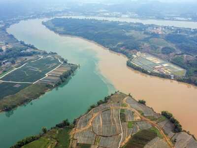 10月31日,航拍广西南宁三江口。三江口位于南宁市江南区江西镇宋村附近,为左江和右江的汇合点、邕江零公里处。近日,夹杂泥沙的左江呈现出黄色,与清澈的右江形成了独特的“鸳鸯江”景观。中新社记者 陈冠言 摄