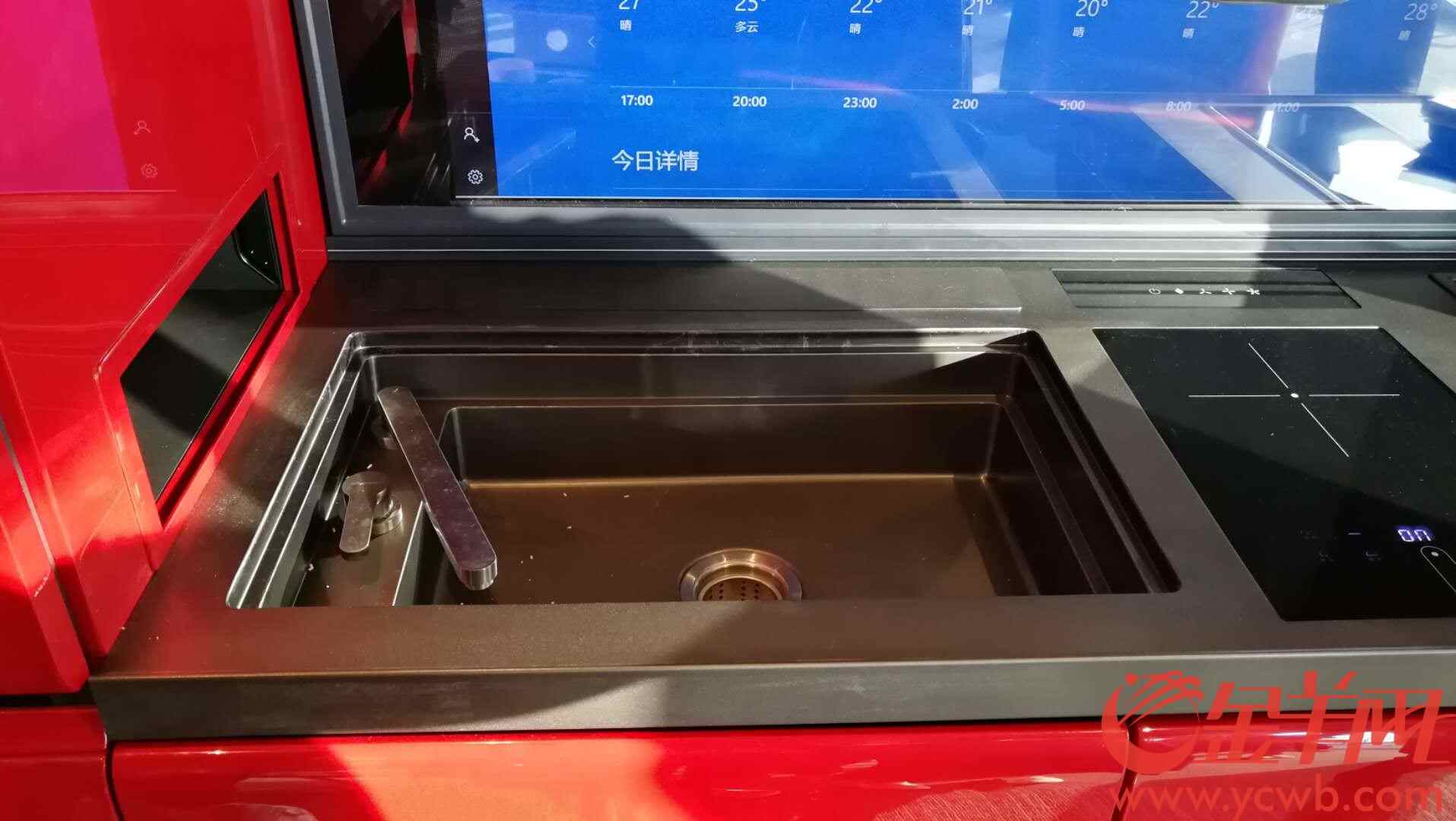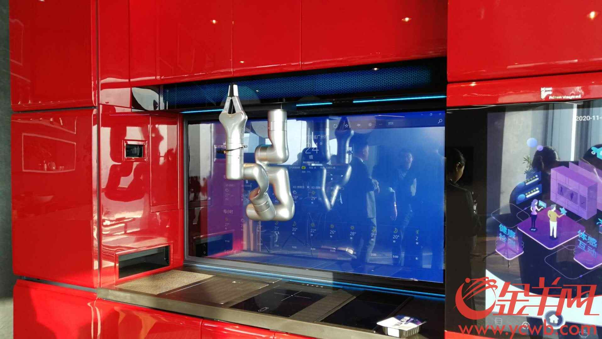 这次展示的是未来的智能厨房以及智能AGV(智能移动平台),羊城晚报全媒体记者在现场看到,智能厨房外观有点像一个三米长的橱柜,只不过中间多了个机械臂,墙面多了液晶显示屏。