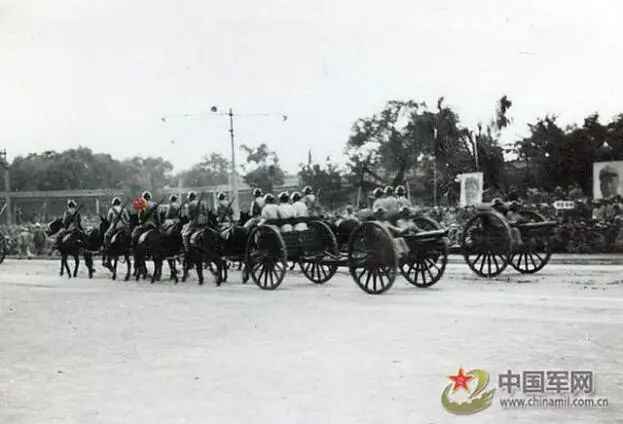 开国大典阅兵式上的日制三八式75毫米野炮,由骡马牵引
