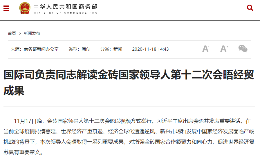 据商务部网站消息,11月17日晚,金砖国家领导人第十二次会晤以视频方式举行。习近平主席出席会晤并发表重要讲话。在当前全球疫情持续蔓延、世界经济严重衰退、经济全球化遭遇逆风、新兴市场和发展中国家经济发展面临严峻挑战的背景下,本次领导人会晤取得一系列重要成果,对增强金砖国家合作凝聚力和向心力、促进世界经济复苏具有重要意义。