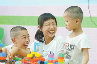 不远处,“儿童空间”的房子里,游戏玩得正酣:12个小孩子,手拉手坐成一圈,把辅导员陈梅围在正中间。仔细打量,这个“儿童空间”分为两部分,进门是游乐区,里间是学习区,课桌、书架一应俱全。