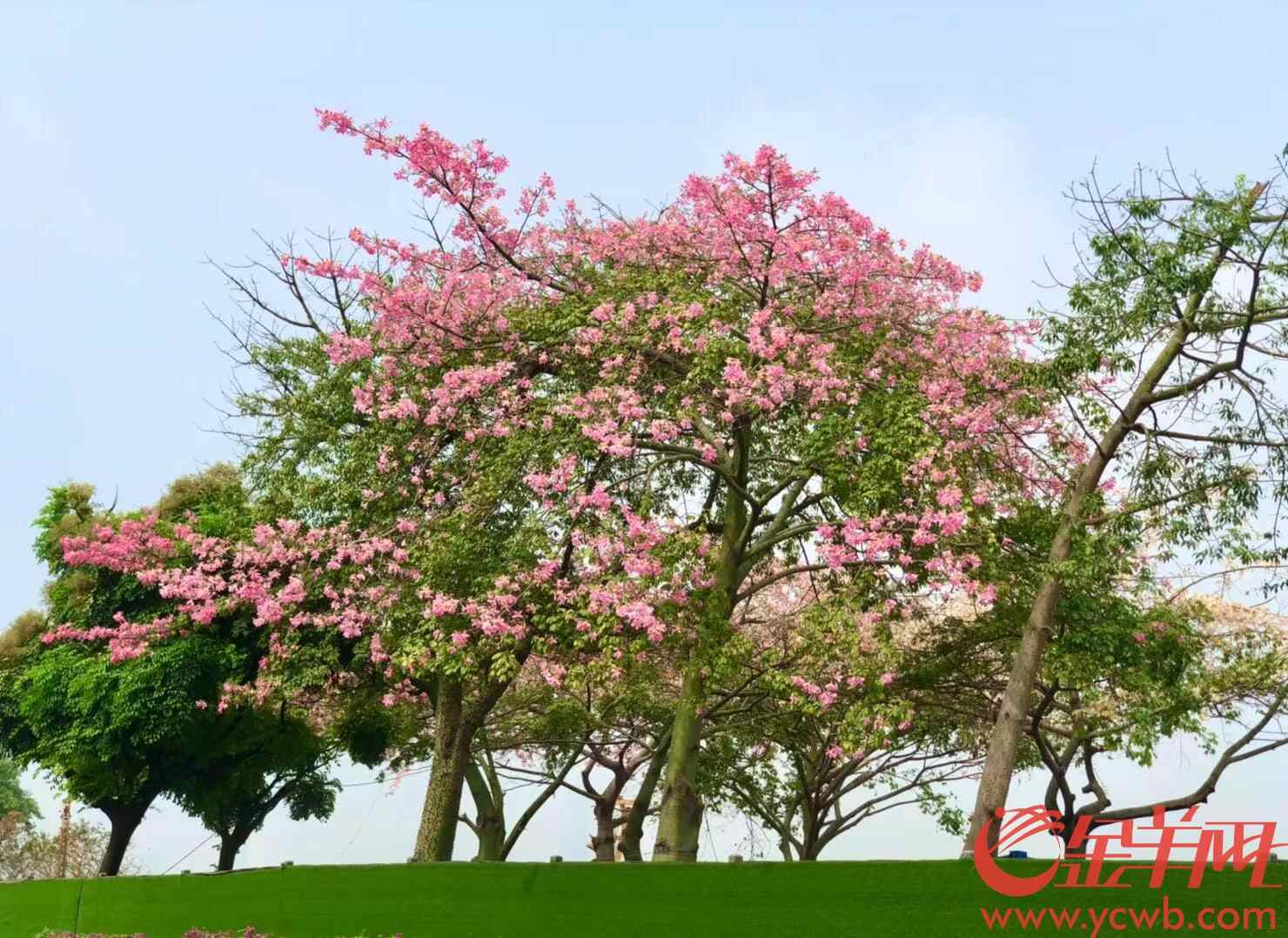如今市区内多处主干道和高速路的出入口处等地方都有美丽异木棉的倩影。一到秋冬季节异木棉高大的树冠像撑开的一把伞把广州的道路、公园、校园装饰成一片粉色的海洋。