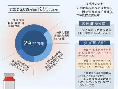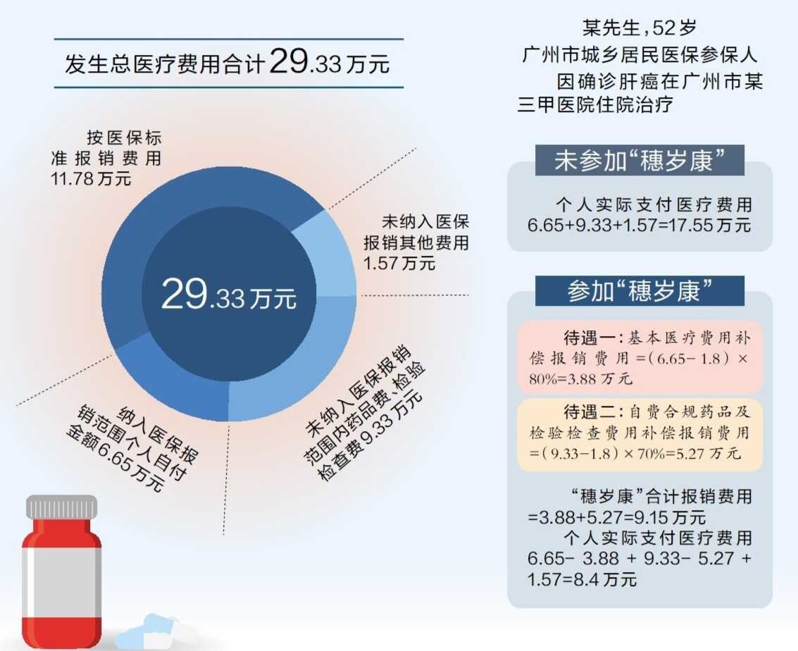 广州市医疗保障局党组书记邓佑满举了一个例子。某名广州市城乡居民医保参保人,因确诊肝癌在广州市某三甲医院住院治疗,发生总医疗费用合计29.33万元,其中按医保标准报销费用11.78万元,个人支付17.55万元。如果参加了“穗岁康”,“穗岁康”可为该参保人再报销9.15万元,个人实际只需支付8.4万元。