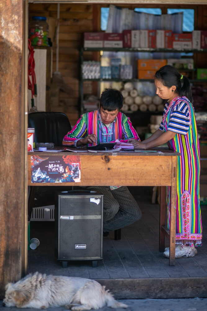 在云南省贡山独龙族怒族自治县独龙江乡迪政当村,独龙族青年李斌(左)和妻子李元梅在自家开的小卖部统计当天收入(10月29日摄)。新华社记者 胡超 摄