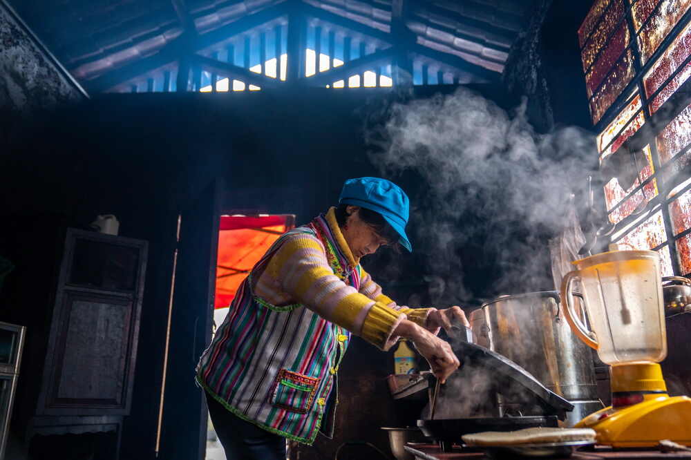在云南省贡山独龙族怒族自治县独龙江乡孔当村,独龙族老人当那在厨房烙饼(11月1日摄)。新华社记者 胡超 摄