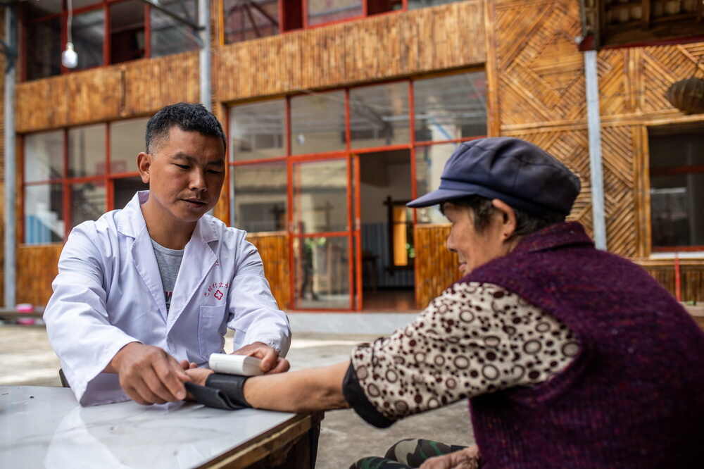 在云南省贡山独龙族怒族自治县独龙江乡巴坡村,村医孟文新给独龙族老人马桂英测量血压(10月26日摄)。新华社记者 胡超 摄