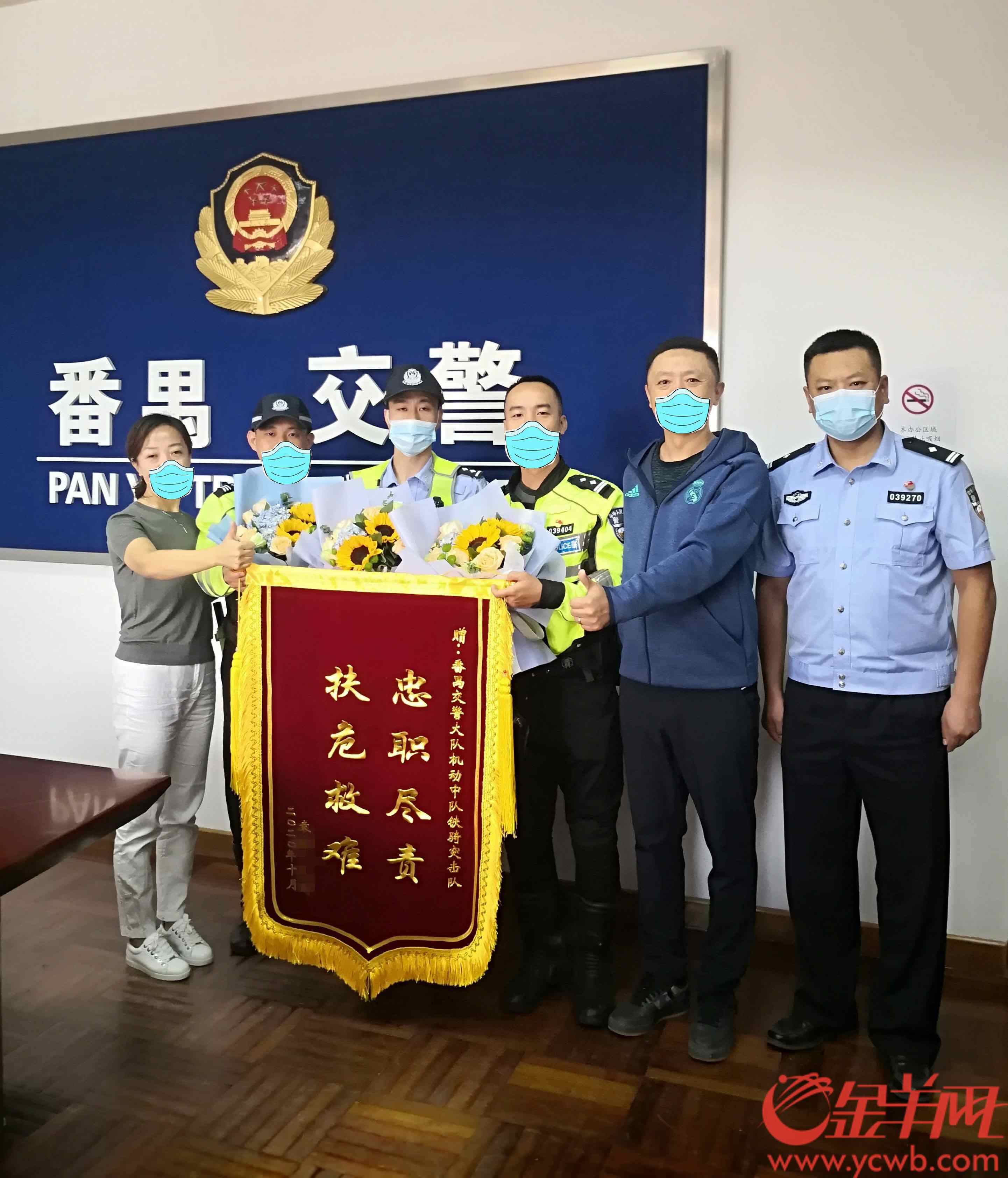 日前,袁婆婆家人到番禺交警大队向参与本次救援行动的执勤队员送上鲜花及锦旗致谢,袁婆婆家人说:“当时医生说我妈妈的右眼周边的骨头全部骨折,脑后扩散性出血,幸亏抢救及时,否则就有生命危险,或者造成非常严重的脑部损伤。现在我妈妈已经能下地行走十多步了!真的十分感谢你们!”