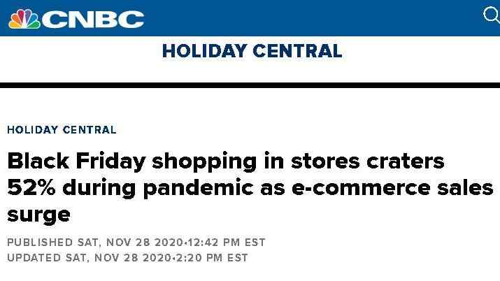△CNBC报道,“黑色星期五”期间,传统实体店的客流量与去年相比骤降52%