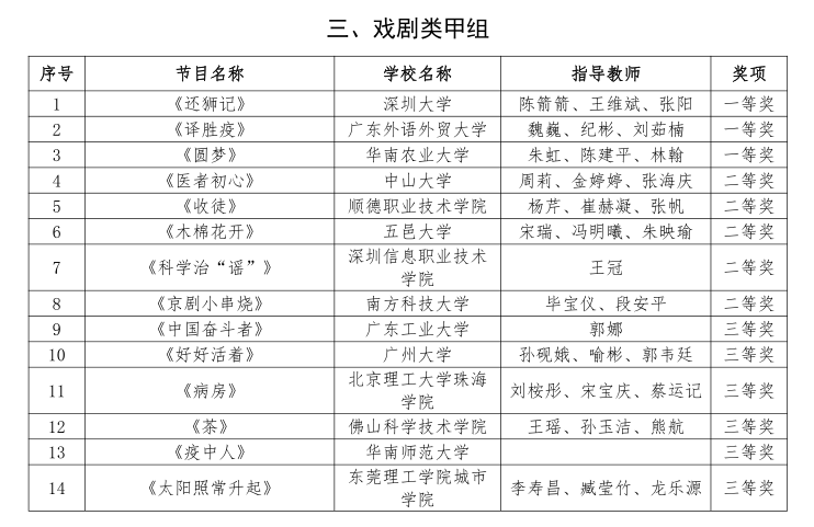 广州大学人文学院组织排演并代表广州大学参赛的话剧节目《好好活着》与诗朗诵节目《致抗疫一线的无名英雄》通过初赛选拔,进入省级决赛。最终,《好好活着》获得戏剧类甲组三等奖和优秀创作奖,诗朗诵《致抗疫一线的无名英雄》获得朗诵类甲组三等奖和优秀创作奖,微电影《重逢》获得微电影类甲组三等奖。