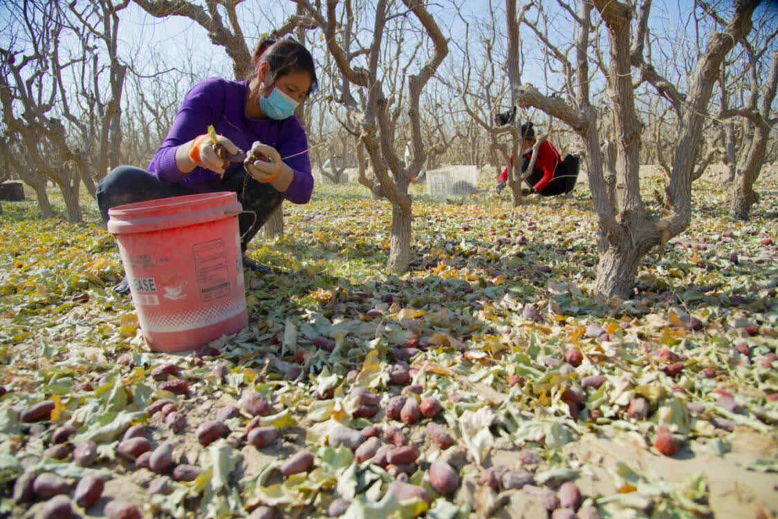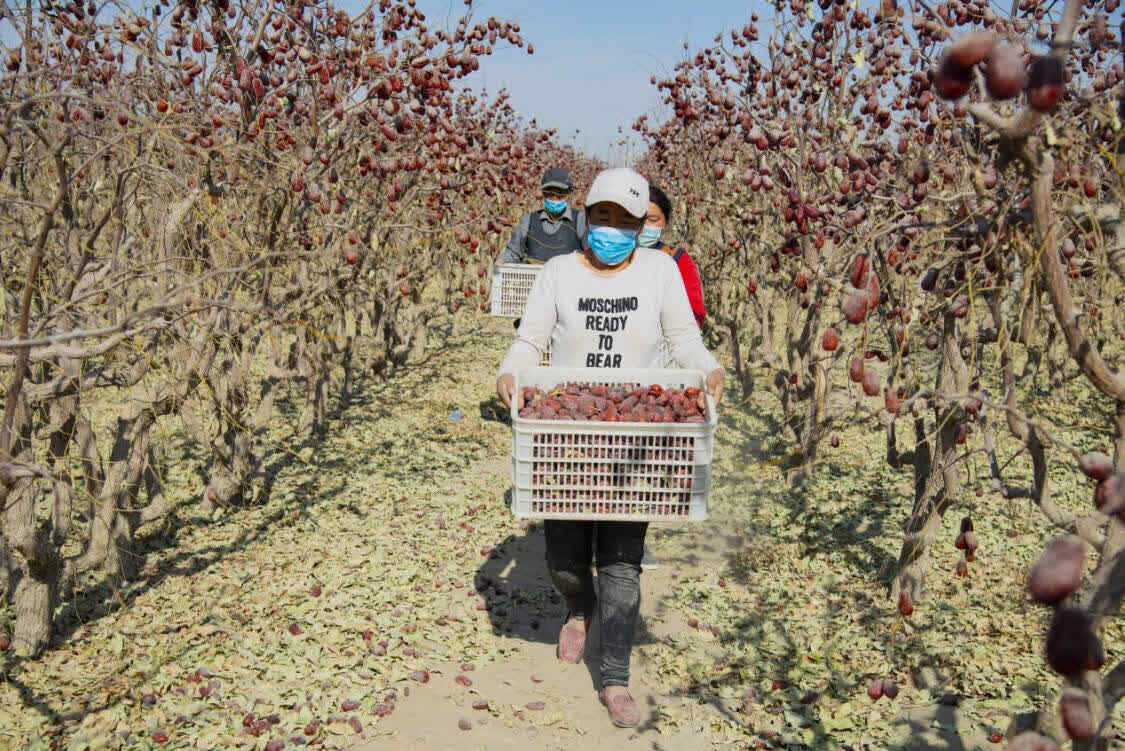 工人们正在枣园收捡红枣(买买提艾力摄)