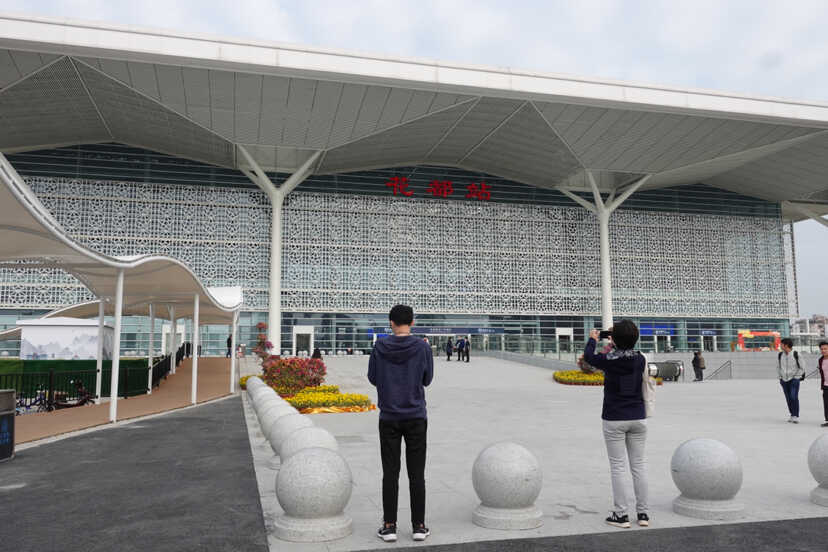 花都站毗邻广州北站西侧,为一座地面铁路车站,采用上进下出的旅客流线模式,崭新的玻璃幕墙吸引不少人拍照留念。通过安检进入大厅后,站内干净明亮,车次信息清晰,大约每半小时就有一辆开往清城或白云机场北的列车。