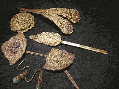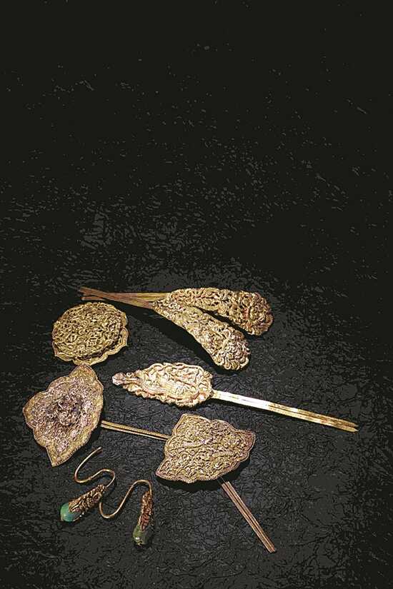 不同于现代机器制作的黄金,古法黄金饰品用料密实,鎏金、花丝镶嵌、锤揲、金银错、掐丝、錾花等工艺繁多,体现出手工美感。穿越了岁月而来的这些黄金器物、首饰,华而不炫,贵而不显,低调中带着雍容与华贵。