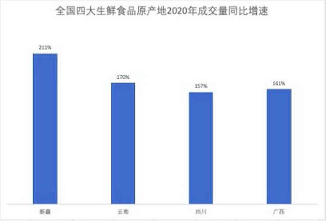西部地区特色农产品插上电商的翅膀,追赶势头明显。新疆、四川、云南、广西全国四大生鲜食品基地中,成交量同比2019年增速都超过150%。