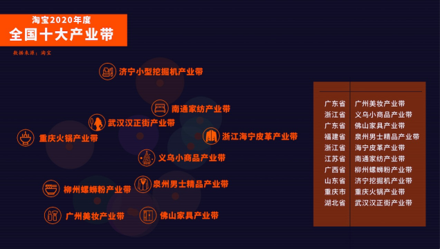 1月4日,淘宝公布2020年度十大产业带,广东广州美妆、浙江义乌小商品、广西柳州螺蛳粉、山东济宁小型挖掘机、湖北武汉汉正街等产业带入选。与往年“头部”产业带被东部的珠三角、长三角和福建沿海“霸榜”不同,如今呈四面开花态势,特别是西部、中部有3个产业带爆发式的增长,挤进TOP10。
