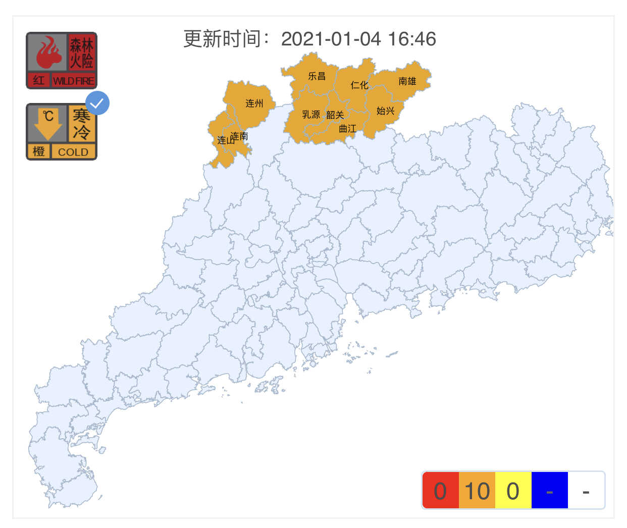1月4日16时46分,广东全省寒冷预警信号发布情况 广东省气象台官网截图