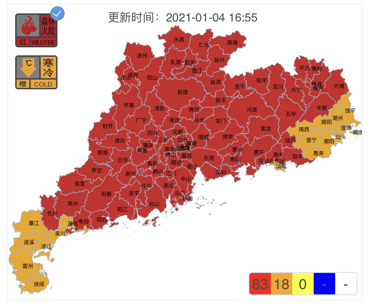 但各位街坊千万不要觉得天气暖了就没事了,另一种和天气有关联的灾害隐患正在加大。截至1月4日16时56分,广东全境皆发出森林火险预警,且大部分地方都发出最高等级的红色预警。