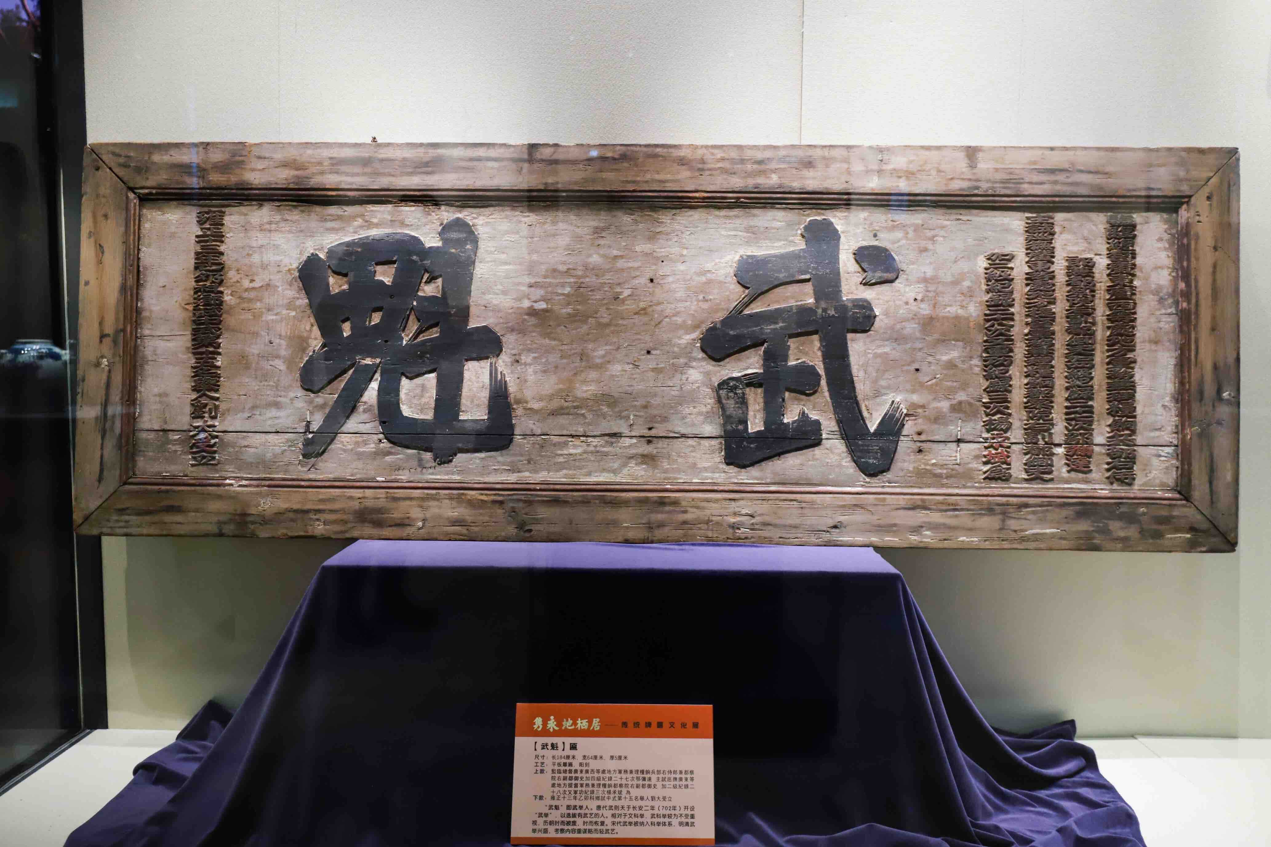 牌匾的价值是多层次、多方面的,涉及社会民俗、思想文化和美学艺术等领域。阅读牌匾,不仅可以欣赏传统书法艺术,还可以学习不同的生活智慧和处世哲学,领悟对美好生活和理想人格的追求。“题字人决定牌匾的价值。”展览策划人黄永亮为记者介绍一块清雍正十三的《武魁(刘大受 受)》匾,“清代重文轻武,赠武魁匾很难得,而且又是在清雍正年间,尤为珍贵。”