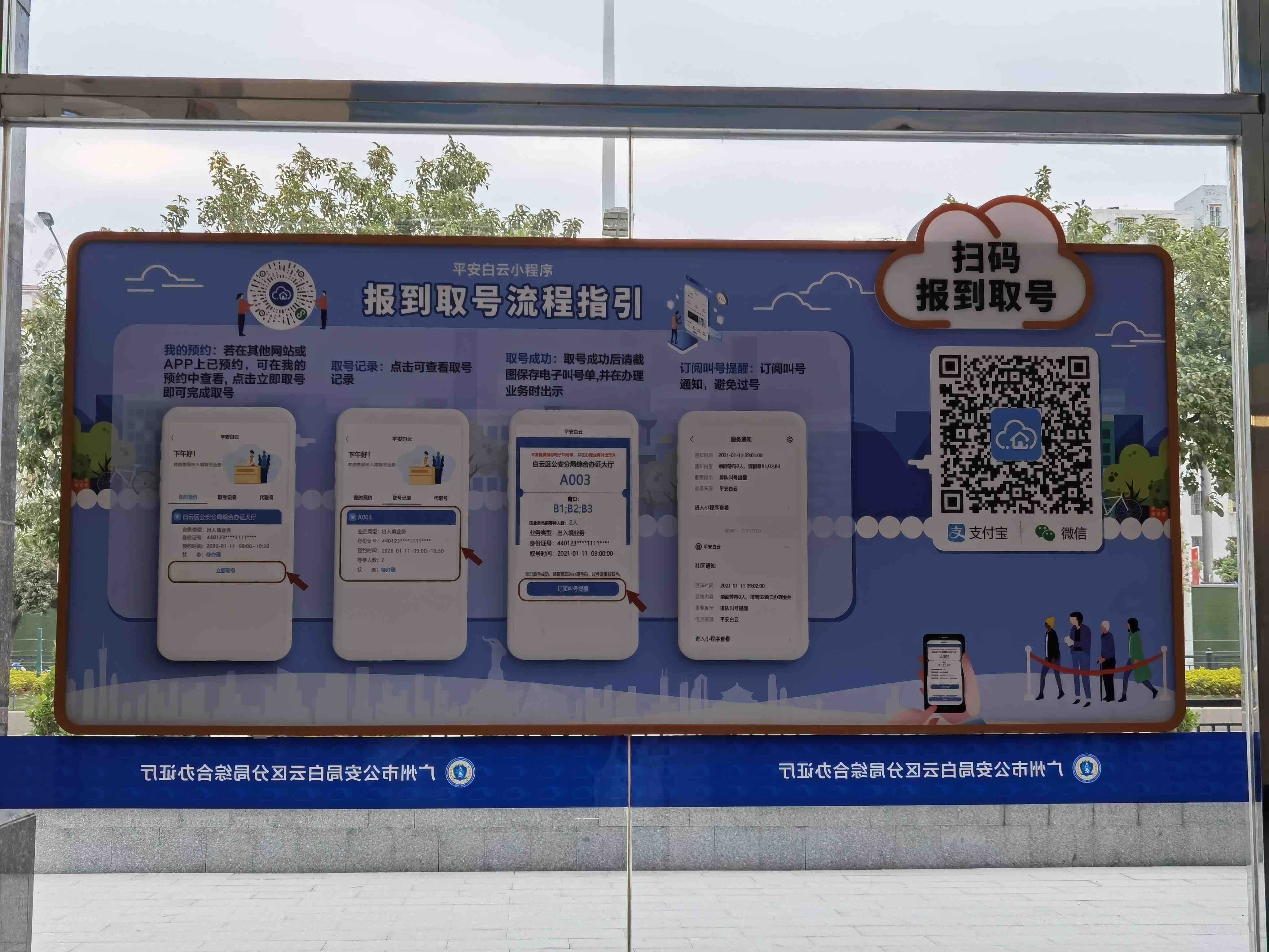 在前台业务办理区,新综合办证厅创新运用智慧取号系统,群众只需通过“平安白云”微信小程序便能自助报到取号,改变传统排队取号的历史,实现无纸化办公。