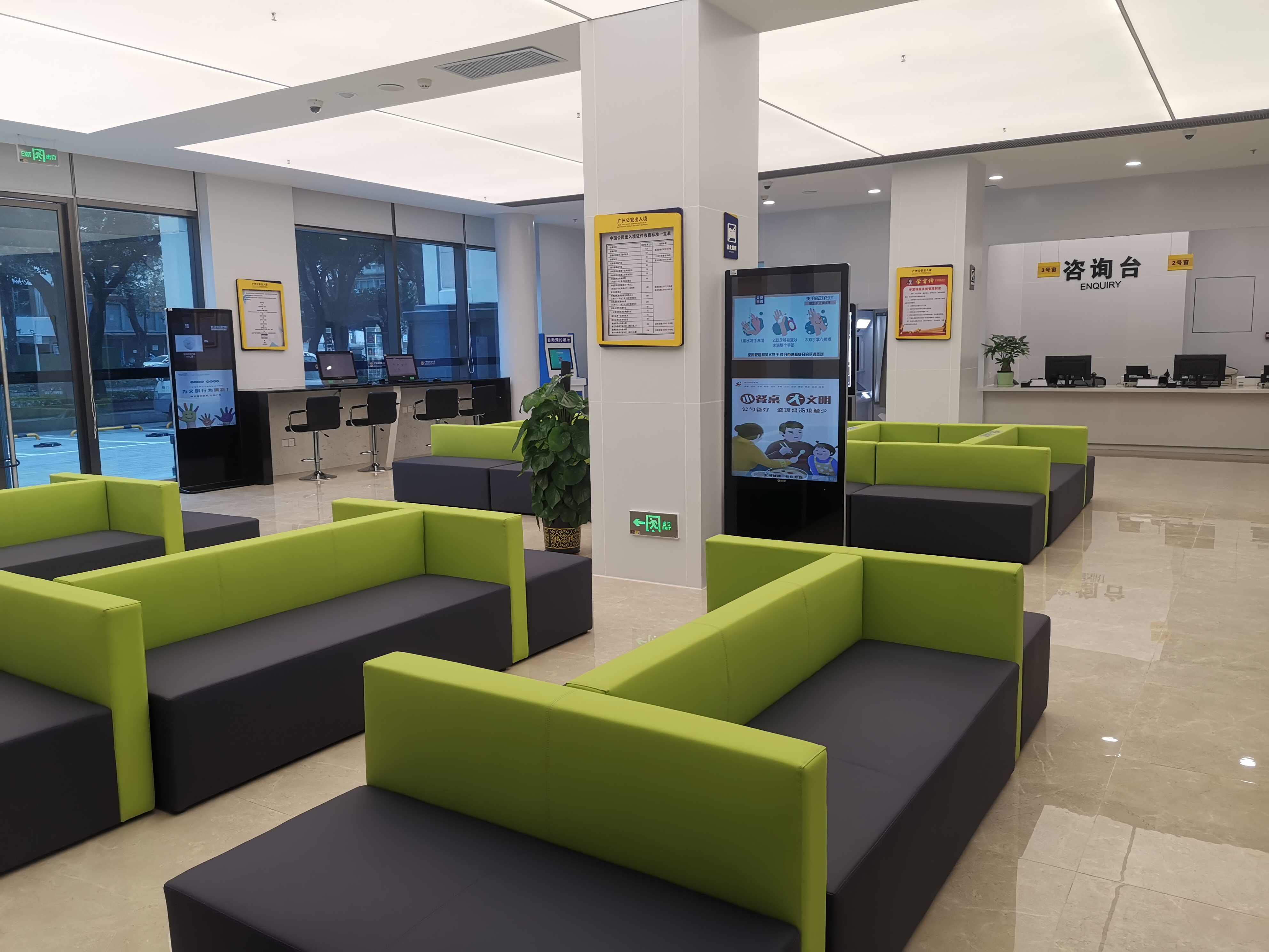 新出入境接待大厅位于越秀区人民北路688号流花展览中心8号馆,办理内地居民、港澳台居民和华侨出入境证件业务。大厅主要分为智慧咨询区、智慧服务区、人工受理区、24小时自助办理区等,建筑总面积达3242平方米。