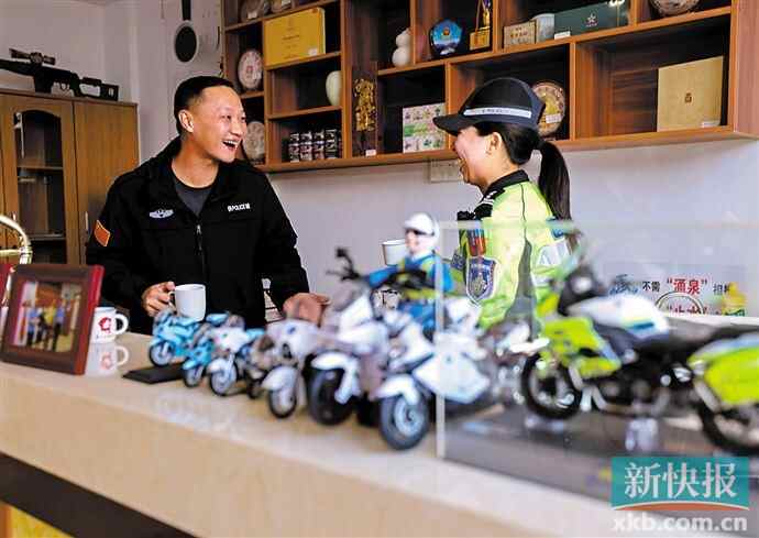 ■执勤归来的铁骑手在咖啡屋享受休闲时光。