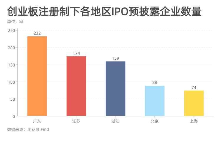 梳理上述1083家拟在注册制下申请创业板上市的企业发现,广东企业申请数量最多,达到232家;紧随其后的是江苏企业,共有174家;排在第三位的是浙江企业共有159家,北京企业88家,上海企业74家。