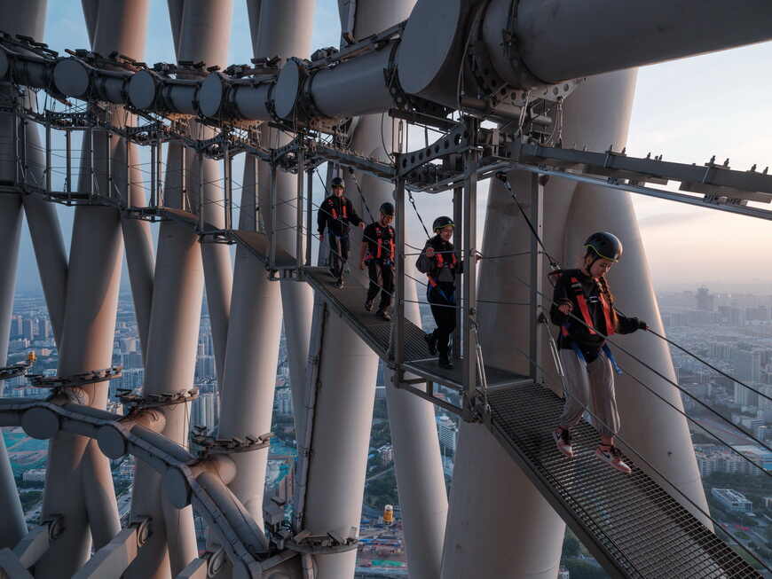 据介绍,经过深度市场调研,反复升级优化设计方案,广州塔阿尔法探索乐园于2019年11月19日进入施工阶段,由法国MND集团完成实地勘测、项目整体策划及器材定制安装,四名具有欧盟认证的绳索穿越技术安装资质证明的工程专家负责项目工程的施工技术管理和质量管控,指导项目整体现场作业进度及项目统筹落地。项目团队先后克服高空施工防坠落、无死角安全防控、悬挂式钢结构平台搭设等多个施工难题,终于于2020年底正式竣工,并且成功通过广东省建科建筑设计院、广州市设计院等多家单位安全评估审核。自此,世界独一无二的高空探险乐园成功面世。